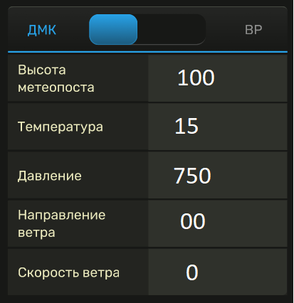+При выборе `ДМК` в области исходных данным последняя строка `Скорость ветра`.